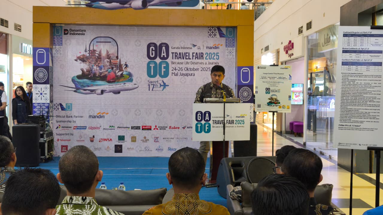 Jayapura, 24 Oktober 2025 — Garuda Indonesia bersama Bank Mandiri resmi membuka Garuda Indonesia Travel Fair (GATF) 2025 yang berlangsung di Mall Jayapura. Acara ini dibuka secara resmi oleh Kepala Biro Perekonomian dan Administrasi Pembangunan Setda Provinsi Papua, yang hadir mewakili Gubernur Papua, Komjen Pol (Purn) Mathius D. Fakhiri, S.I.K., M.H.